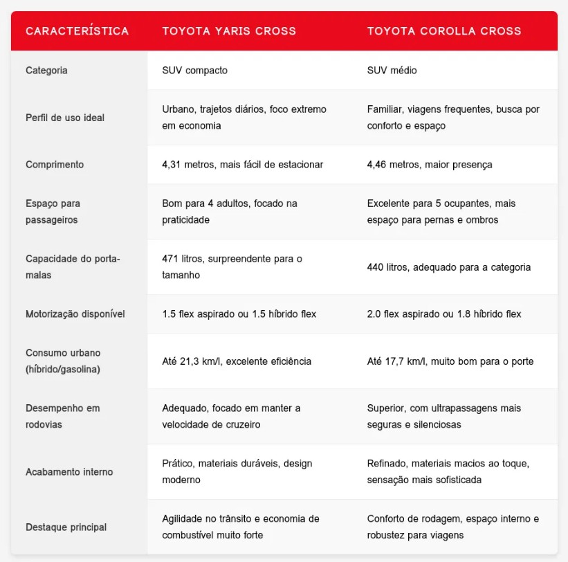 O Yaris Cross chega como a grande novidade da marca, um SUV compacto projetado para ser extremamente eficiente na cidade. Do outro lado, o Corolla Cross já é um sucesso consolidado, oferecendo o porte e o conforto de um SUV médio para quem precisa de mais espaço e presença nas ruas.